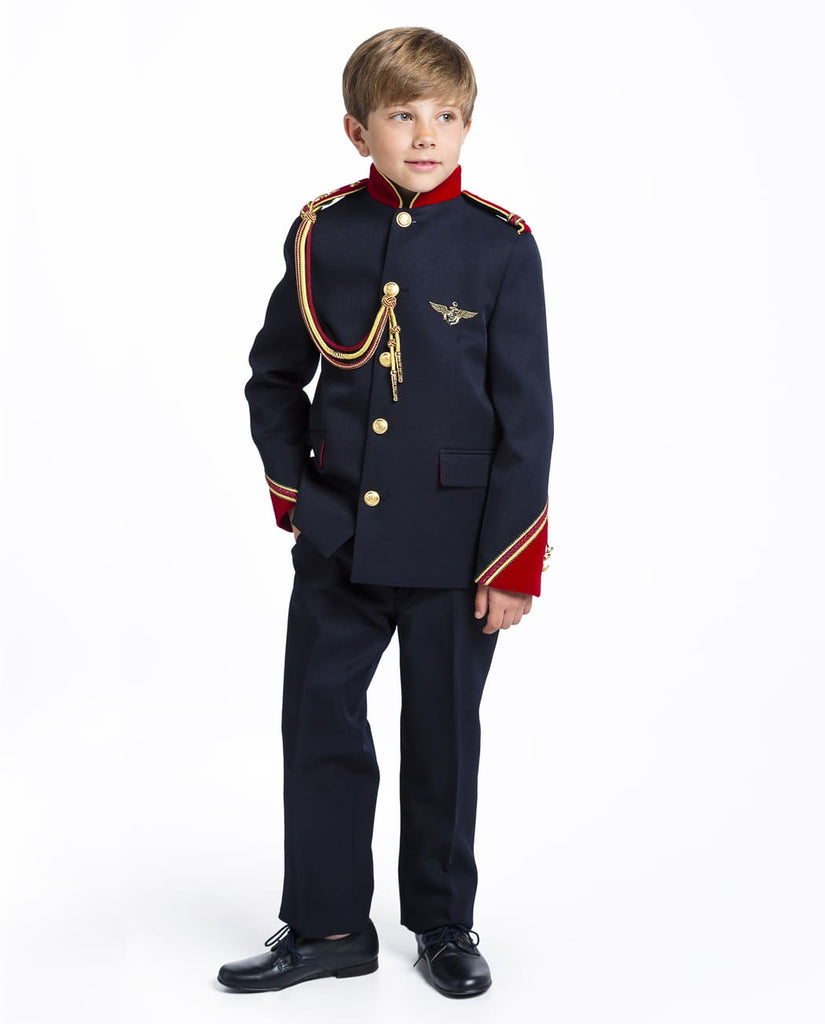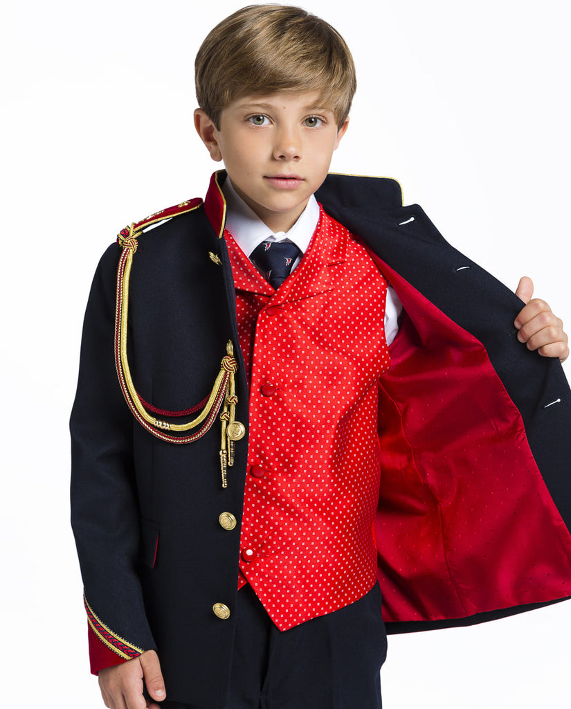 Americana color azul marino con el cuello mao y detalle rojo en manga, en terciopelo ambos, chaleco rojo estampado y corbata azul marino. Galones en rojo y escudo bordado a juego en la chaqueta. Gemelos, detalles y botones a juego.