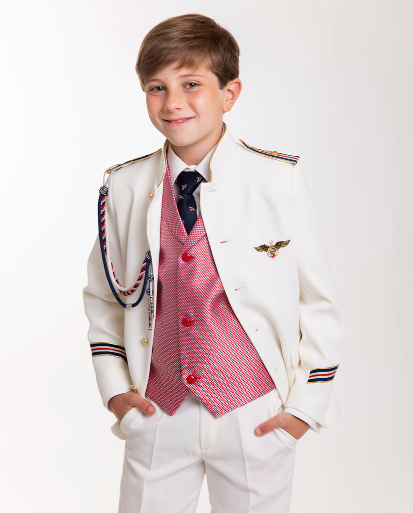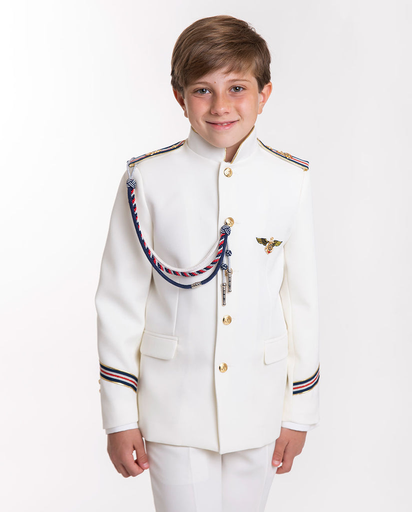 Americana color crudo con el cuello mao y detalles en dorado. Chaleco en tonos rojos y corbata azul marino con estampado. Galones en dorado, azul y rojo y escudo bordado a juego en la chaqueta. Gemelos, detalles y botones a juego.